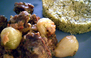 Cortar la carne en cubos, freír con el ajo. Salpimentar. Una vez que esté bien dorada, llevar a olla y con el vino y mantener hidratado con agua caliente sin que la carne se seque. Cocinar por 45 minutos afuego medio bajo, hasta que la carne esté bien blanda e impregnada del vino. (Puede ser más tiempo)